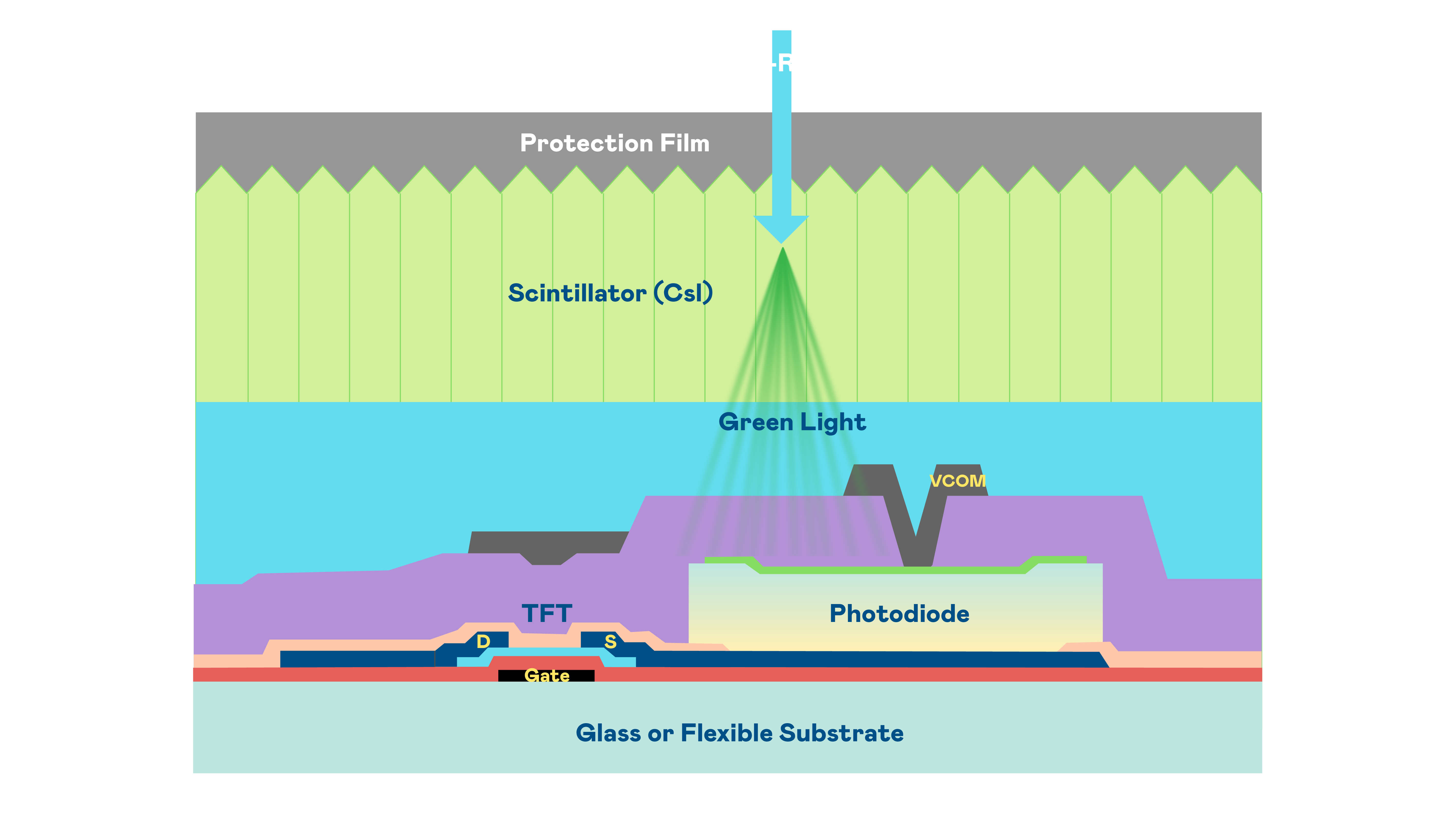 金年会jinnianhui官方在线登录的X光影像感測陣列使用薄膜電晶體 (TFT) 作為每個像素的讀取開關,搭配光電二極體(Photodiode)的光電轉換元件,用以感測X光影像訊號。